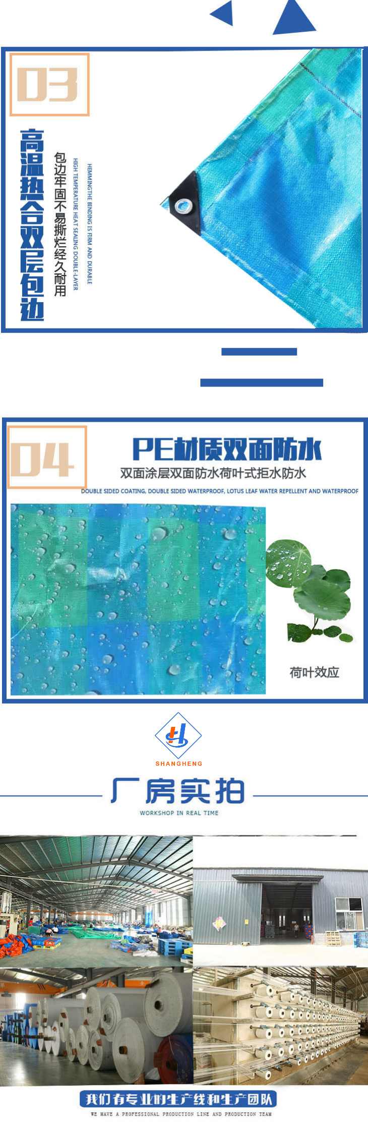 海藍格色PE防水篷布3、高溫熱合雙層包邊,包邊牢固不易撕爛經久耐用;4、PE材質雙面防水雙面涂層雙面防水,荷葉式聚水防水。臨沂尚恒篷布廠家實拍,篷布源頭生產廠家。