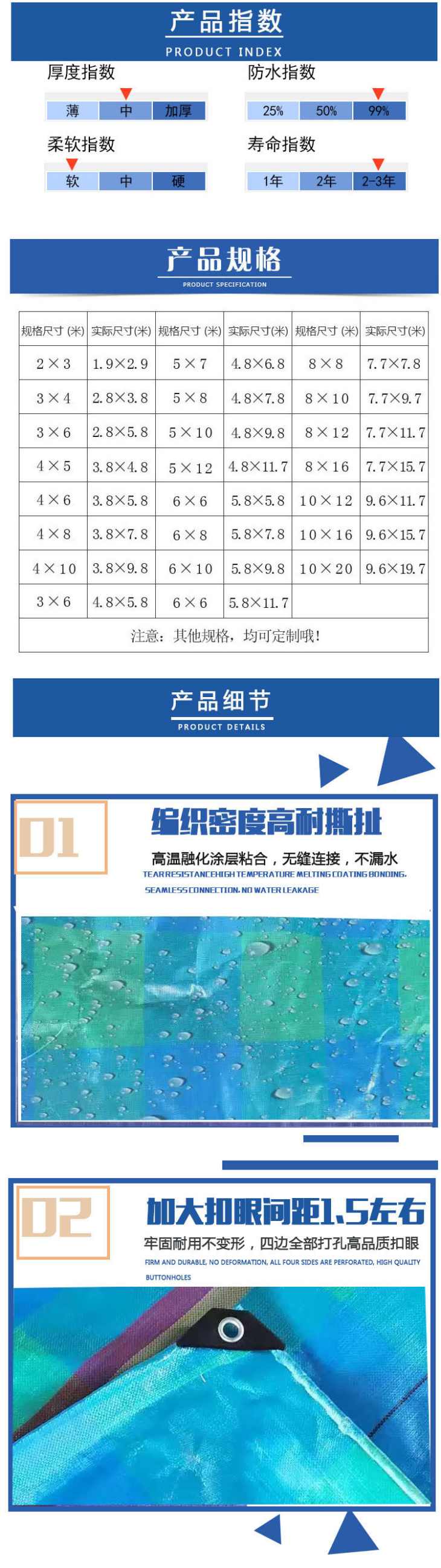 海藍格色PE防水篷布產品細節,1、編織密度高耐撕扯,高溫融化涂層粘合,無縫拼接,不漏水;2、加大扣眼間距1.5米左右,牢固耐用不變形,四邊全部打孔高品質扣眼。